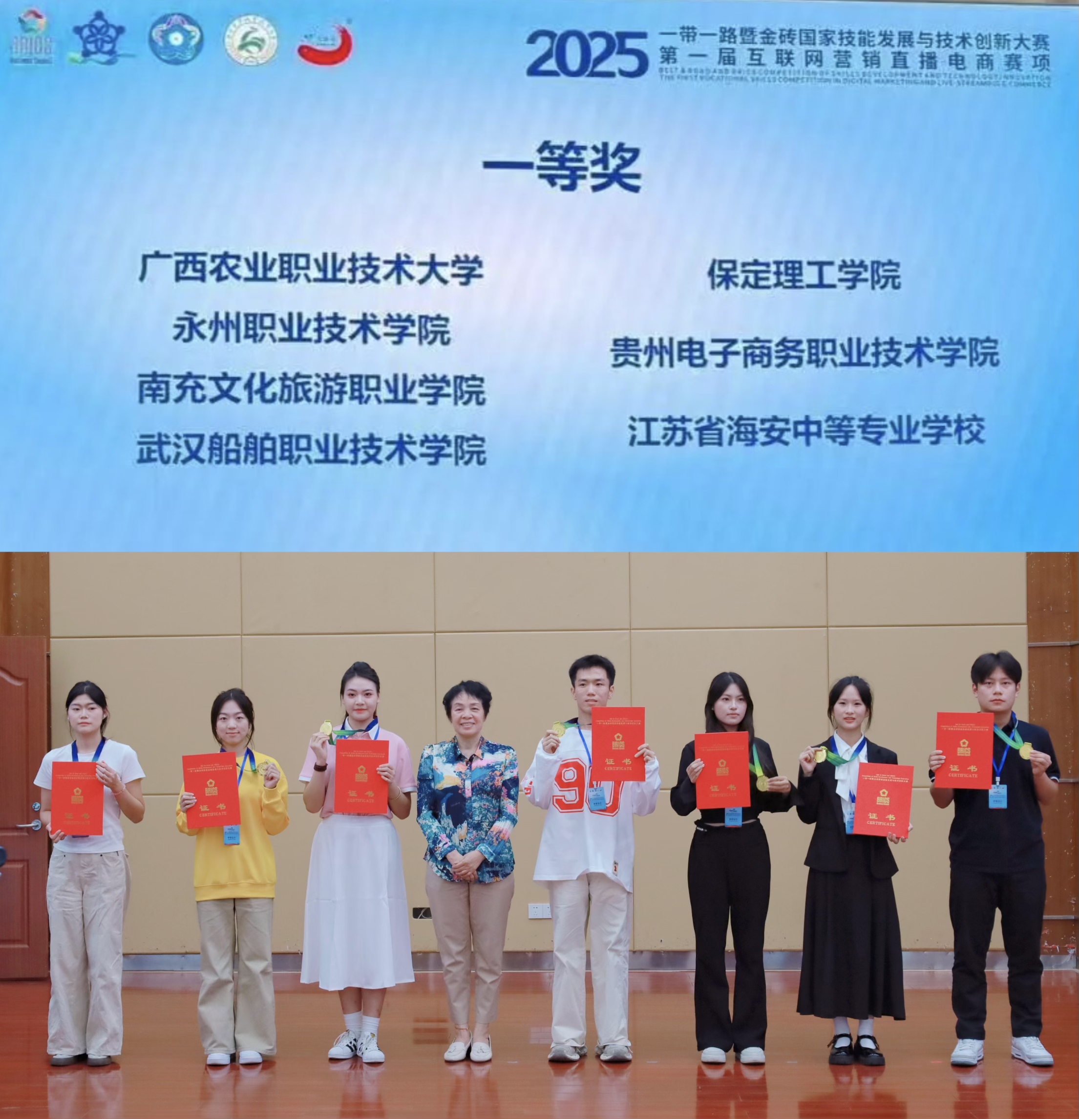 10月25日,2025年一带一路暨金砖国家技能发展与技术创新大赛第一届互联网营销直播电商赛项(高职组)全国总决赛在广西农业职业技术大学举行。我系参赛团队杜熠、高雪雅、蒋思瑶、洛古里各四位学子,在张婷、谢雨潇老师的指导下,凭借扎实的专业知识、出色的实战能力和稳定的赛场发挥,斩获全国一等奖。同时,张婷、谢雨潇老师获评“优秀指导教师”,学校荣获“最佳组织奖”。