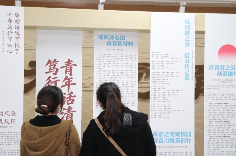 集中学习结束后,师生一行前往廉洁文化活动暨创作大赛作品展现场。在学院展播讲解员的引导下,大家逐一参观各类参展作品,详细了解作品的创作背景、艺术形式及廉洁主题表达。一幅幅主题鲜明的画作、一篇篇情真意切的文稿、一件件构思精巧的手作,生动诠释了廉洁文化的丰富内涵。自由参观环节,师生们驻足凝视、相互交流,结合自身经历畅谈对廉洁的理解。现场交流中,党员教师分享了教学中廉洁育人的实践经验,引导学生树立正确价值观;优秀学生代表结合成长经历,阐述了青年一代践行廉洁的具体计划,互动提问环节让廉洁理念在思想碰撞中不断深化。