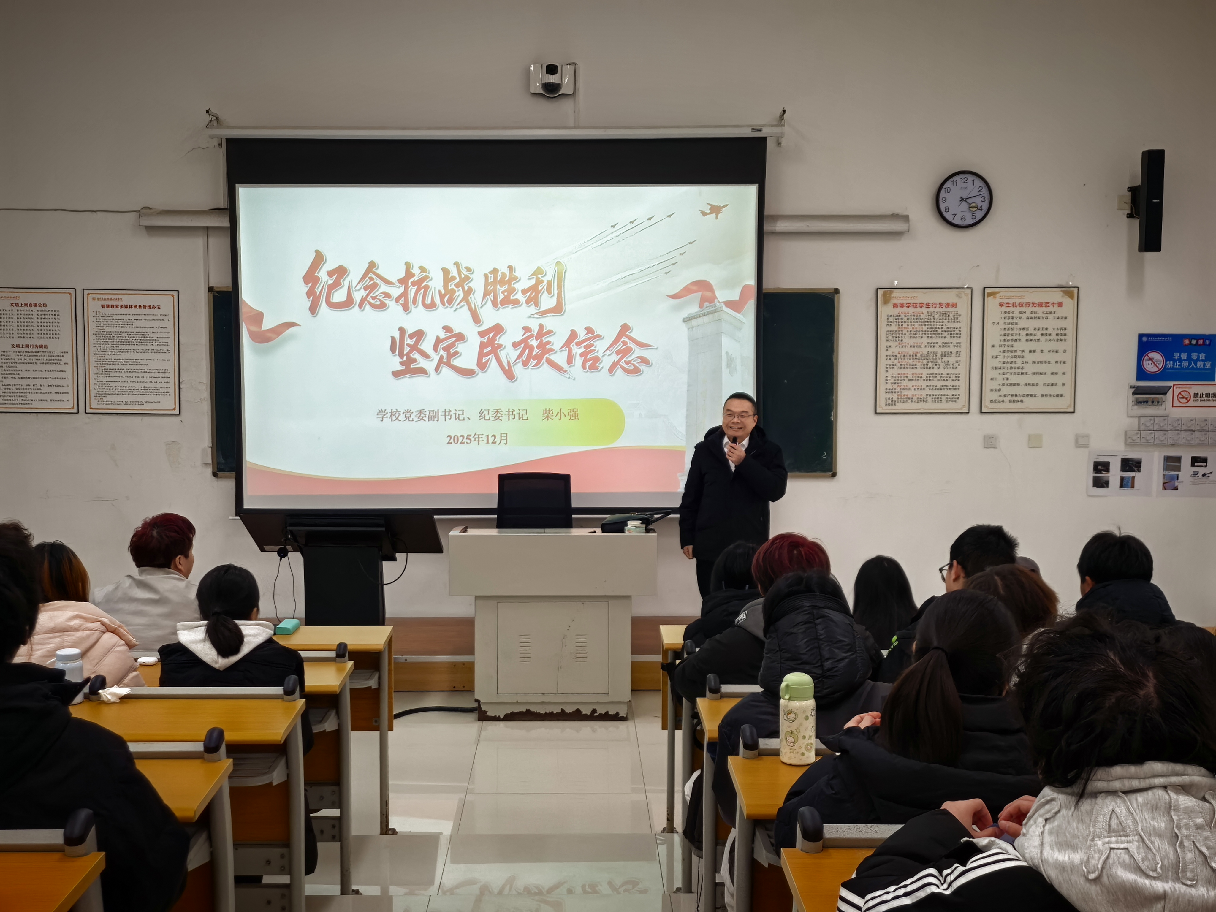 为引导师生铭记抗战历史、传承红色基因,厚植家国情怀,强化使命担当,12月23日,学校党委副书记、纪委书记柴小强在文经楼104教室,为我系2025级电子商务1-2班92名学生代表、全体辅导员及无课教师,讲授了题为《纪念抗战胜利 坚定民族信念》的“形势与政策”专题课,为在场师生带来一场深刻的爱国主义精神洗礼。