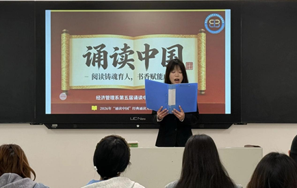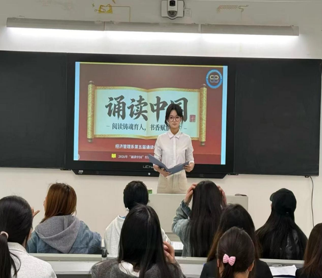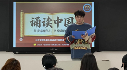 为传承中华优秀传统文化,厚植青年学子家国情怀,丰富校园文化生活。2026年4月9日,我系在文经楼207教室成功举办“诵读中国”经典诵读比赛。本次比赛经过层层选拔,最终筛选出的优秀选手登上舞台,现场氛围热烈浓厚。本次比赛历经层层选拔,脱颖而出的优秀选手最终荣登系部决赛舞台,现场气氛热烈而庄重。
